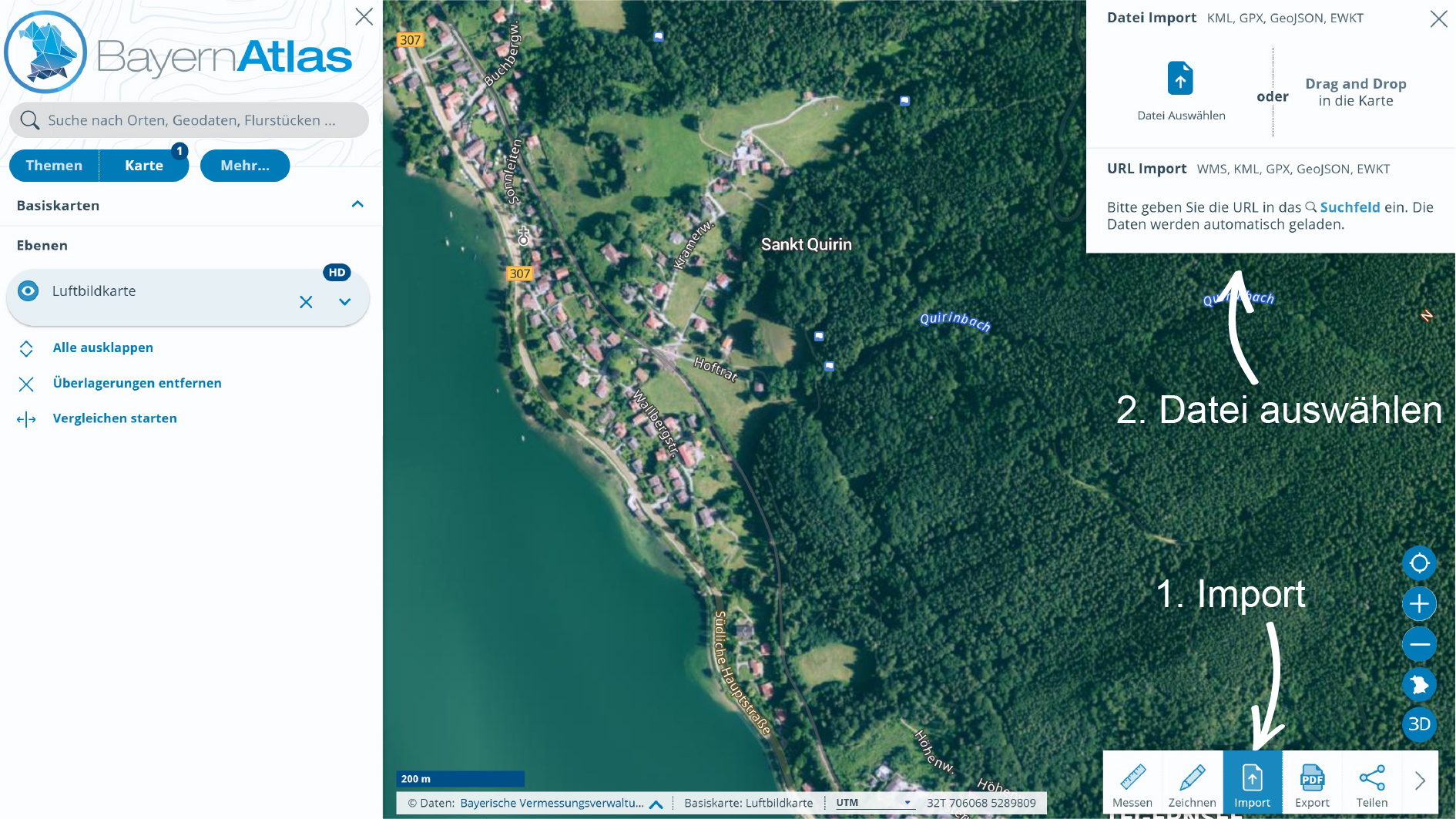 Im BayernAtlas können KML-, GPX- , GeoJSON- und EWKT-Dateien importiert werden.