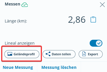 Sie können an verschiedenen Stellen im BayernAtlas durch einen Klick auf den Button Geländeprofil sich das Geländeprofil – einen senkrechten Schnitt durch das Gelände – entlang einer Linie oder Strecke anzeigen lassen: beim Messen, beim Zeichnen, beim Routing.