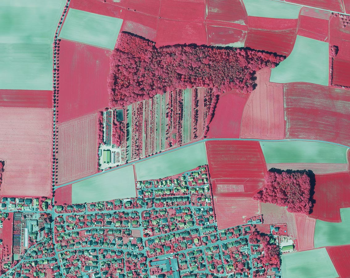 Aus der Luft sind die Christbaumplantagen als kleine Waldstücke besonders schön zu sehen. In Color-Infrarot-Luftbildern heben sich Tannenbäume eindrucksvoll hervor und zeigen die Vielfalt der Bayerischen Weihnachtsbaumkultur.